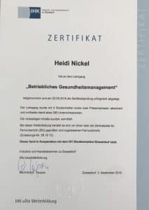 „Ich darf mich nach meinem erfolgreichen Abschluss mit IHK-Zertifikat der Industrie- und Handelskammer Düsseldorf betriebliche Gesundheitsmanagerin nennen. Als Fachkraft im Bereich BGM sind wir in der MGG als unabhängiger Berater und Umsetzungsbegleitung nun auch noch dokumentiert ganz klar in der Lage, gesundheitsbezogene Managementaufgaben im Unternehmen zu begleiten oder eine beratende Tätigkeit auszuüben“, berichtet Heidi Nickel nach ihrer bestandenen Prüfung am 03.09.2018 in Düsseldorf.